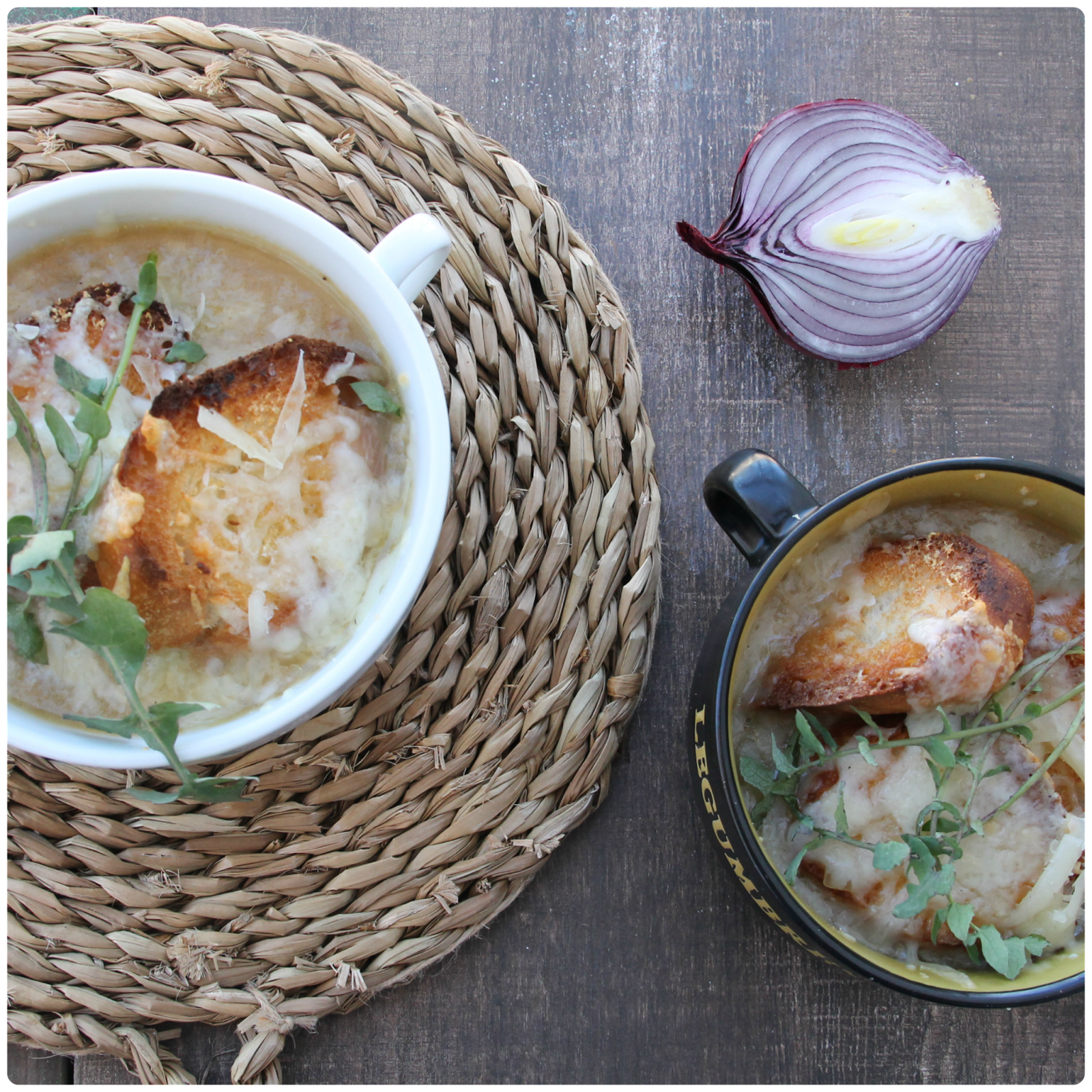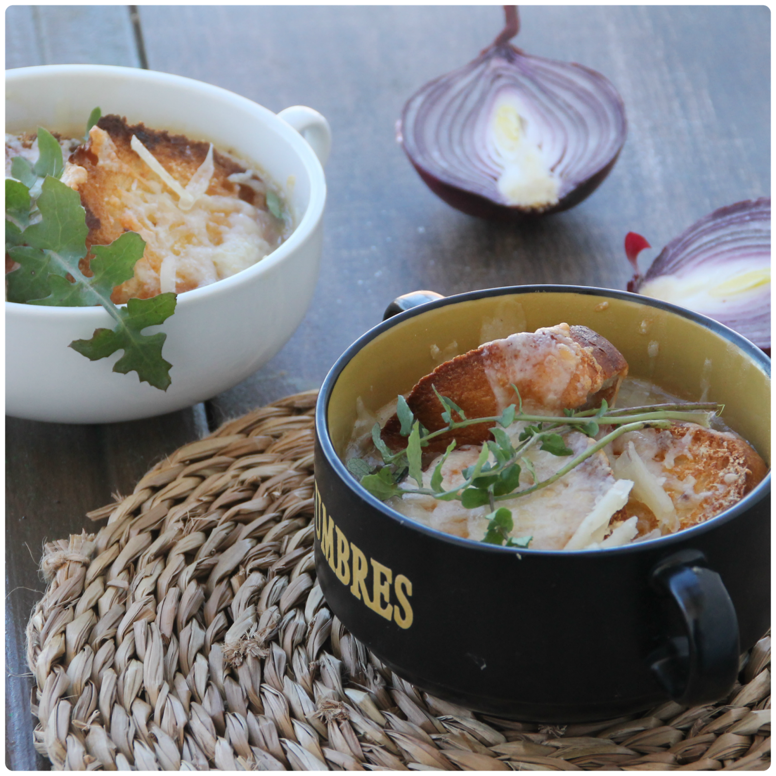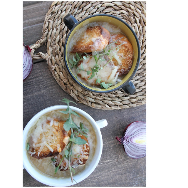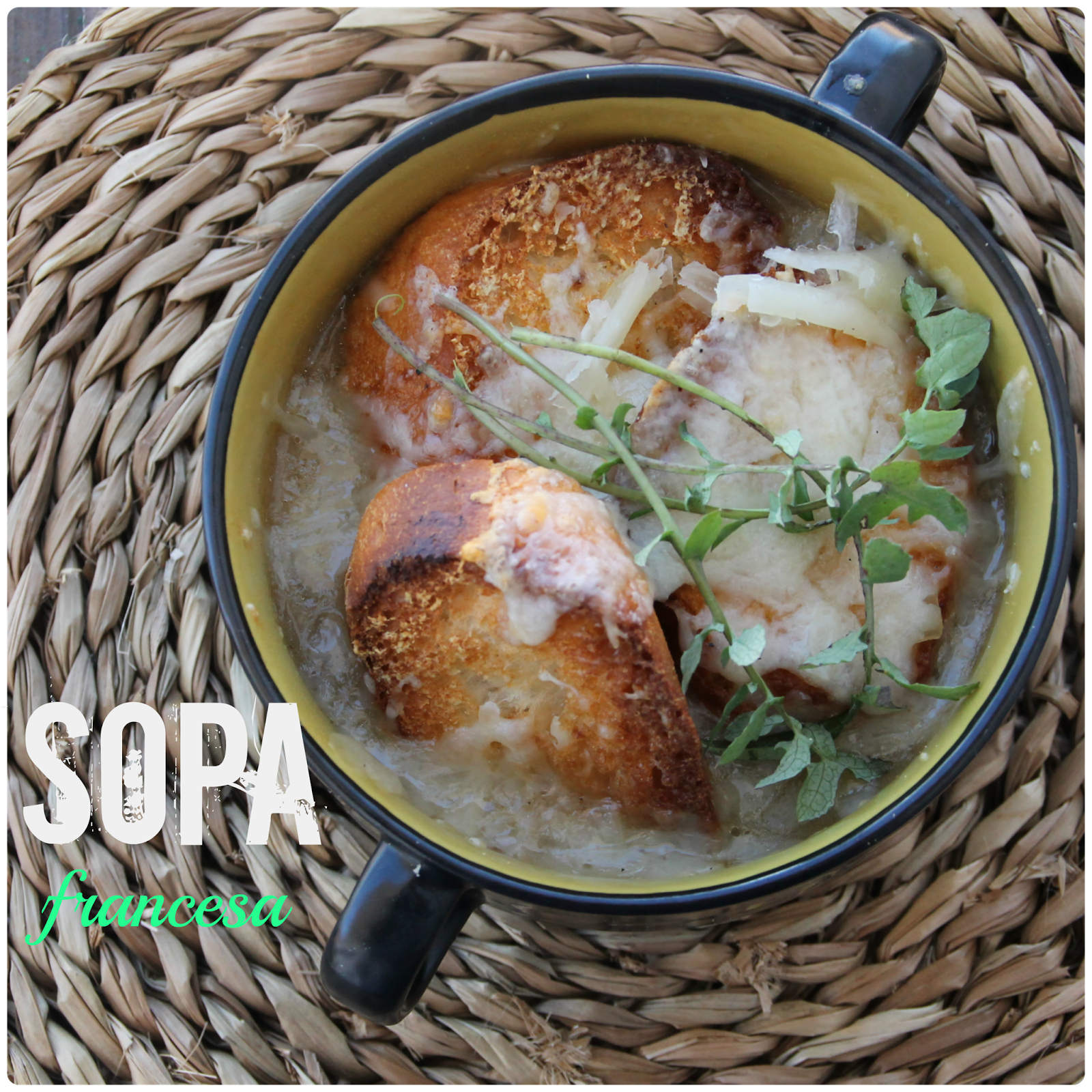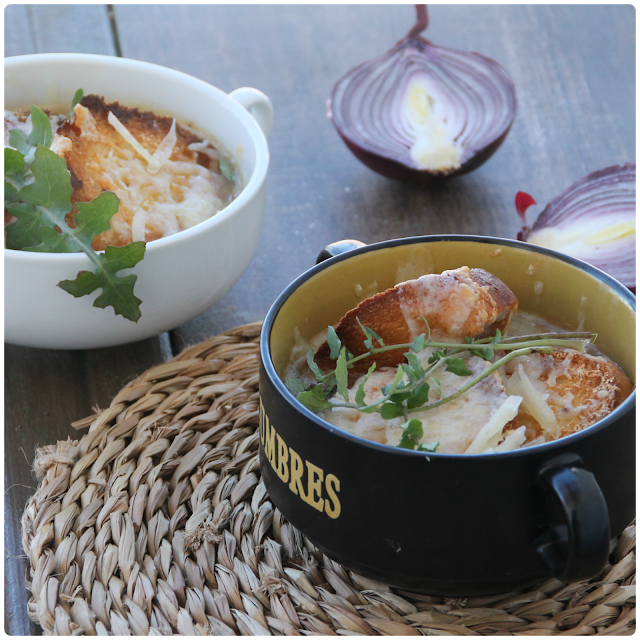 -Colocamos la sopa en unos cuencos , las rebanadas de pan y queso por encima.
