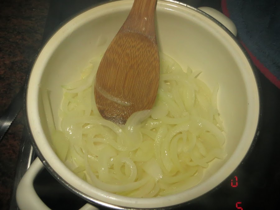 El caldo en este caso lo tenía preparado de un brick, si no preparáis el cado. Mientras tanto en otra olla, echáis un chorro de aceite y pocháis la cebolla cortada en juliana durante quince minutos o hasta que veáis que empieza a estar dorada, este paso es importante, ya que si queda cruda no dará buen gusto a la sopa y si quema habrá que empezar de nuevo.