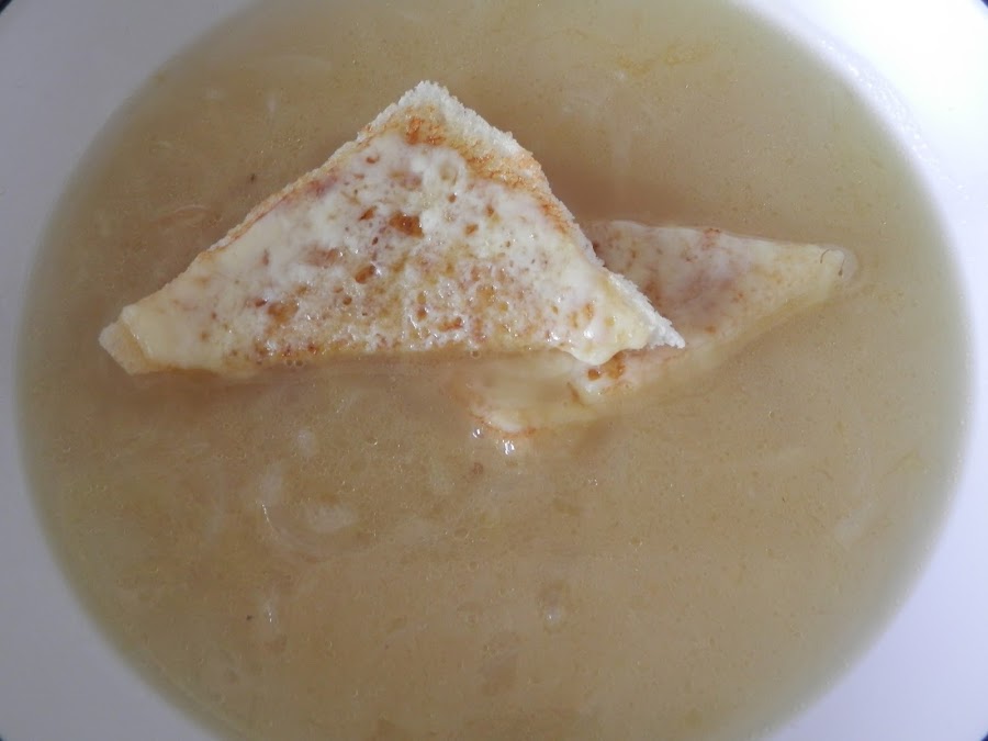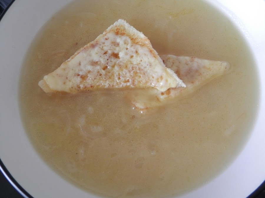 Servimos el plato de sopa y colocamos encima las tostadas con queso.
