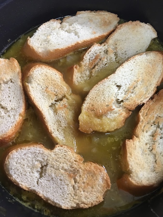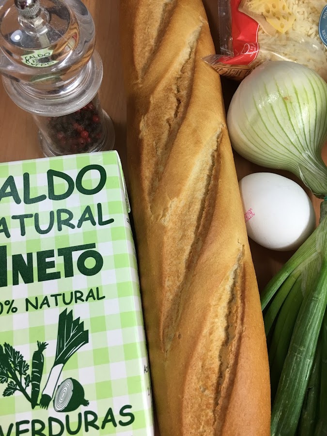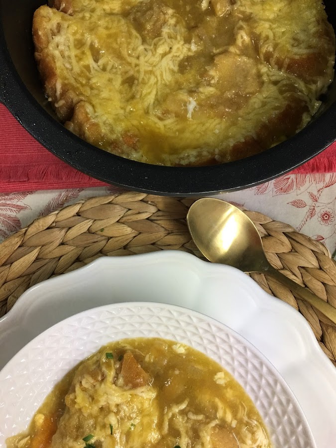 Tenía auténtico vicio de sopita, así que con un buen manojo de cebolletas y un caldo de verduras, con pan duro del día anterior y queso rallado, preparé un delicioso plato de la cocina francesa que rematé en el horno.