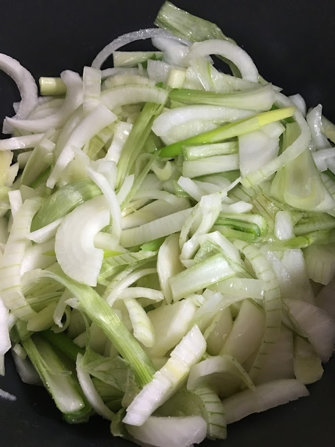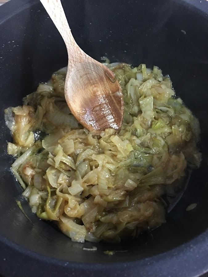 sal y pimientaSe cortan las cebolletas en plumas y se ponen en una cazuela con un poco de aceite de oliva y una pizca de sal. Se pochan durante 45 minutos a fuego bajo-medio.