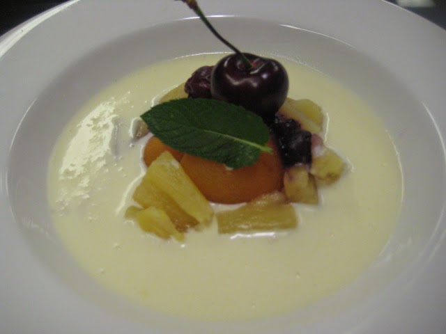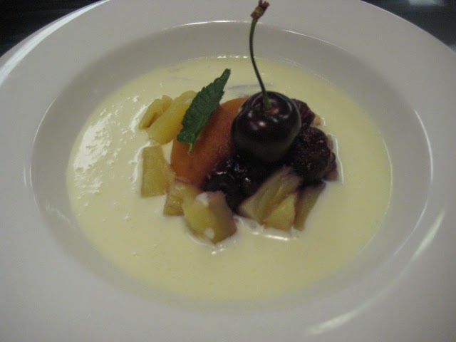 Preparación Para hacer la sopa poner la nata (crema de leche), el azúcar y la leche en un cazo al fuego bajo y cuando empieza a hervir retirar del fuego y verter sobre el chocolate blanco troceado y puesto en un bol. remover bien con varillas para fundir el chocolate y que quede bien homogeneizado Dejar en la nevera para que se enfríe bien. Reservar en la nevera para que se enfrié. Cuando lo vayamos a servir rectificar el punto de espesor si hace falta y poner en plato sopero, copa de Martini, vasito..etc con un poco de crumble o migas de galleta caramelizadas, unas fresas cortadas, mango en dados, albaricoque..etc. Se conserva varios días en la nevera y admite diferentes presentaciones y acompañamientos. Un postre ideal para el verano.