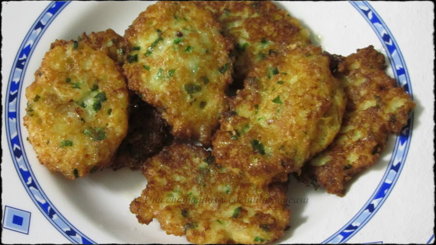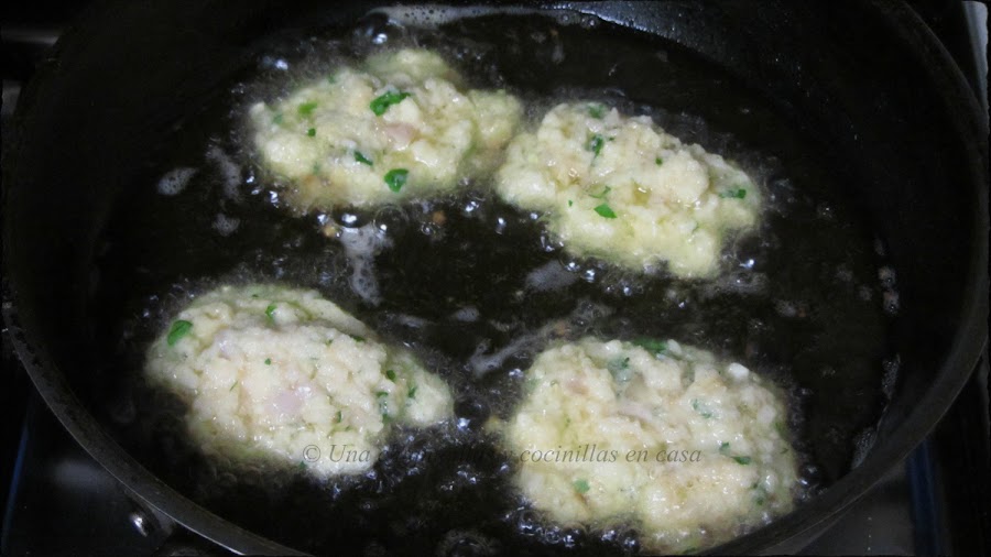 Formar porciones con una cuchara grande y freír en abundante aceite de oliva. Dorarlos bien y no os preocupéis si he han hecho por dentro porque después terminarán de cocinarse en el caldo.