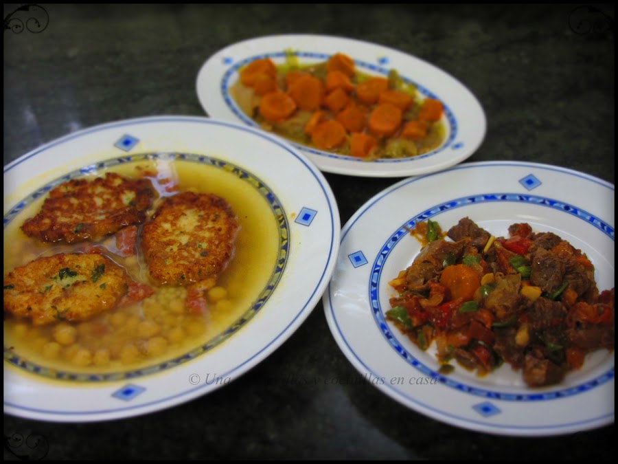 ¿Con el resto de ingredientes? pues preparé una vinagreta con los puerros y las zanahorias. Con la carne de zancarrón, hice un sofrito con un poco de cebolla, pimiento verde y tomate frito y quedó estupendo.