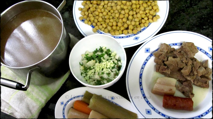 Pasado el tiempo separar los ingredientes del caldo. Poner aparte las carnes, los garbanzos, las verduras y el caldo.