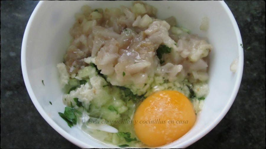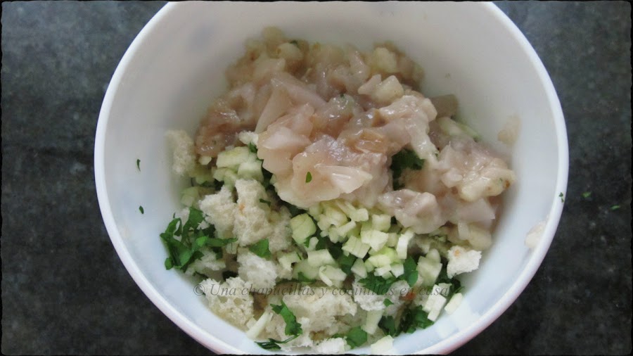 Ahora hay que preparar el relleno, poner en un bol el pan rallado o como yo usé en mi caso pan duro picado, el ajo picado finamente, el perejil, una pizca de levadura en polvo(opcional) y el tocino finamente picado. Añadir los huevos y un poco de sal y remover bien, si veis que queda un poco seco añadir unas cucharadas del caldo.