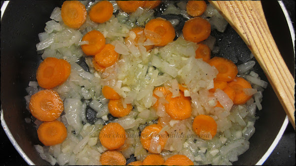 En una cazuela añadimos otro chorrito de aceite y salteamos la cebolla y el ajo. Cuando empieza a transparentar agregamos la zanahoria y la rehogamos a fuego suave.