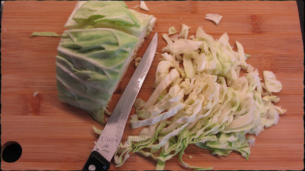 Cortar la col china en tiras y lavar, si no tenéis col china usar col normal como yo.