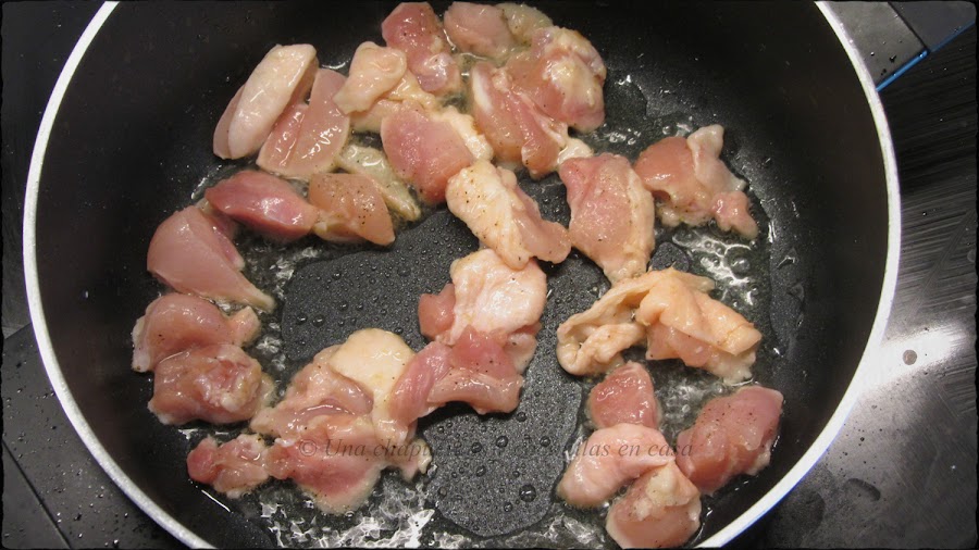 A continuación poner a calentar en una sartén un poco de aceite y sellar el pollo. Reservar.