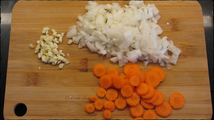 Cortar la cebolla y los dientes de ajo en trozos pequeños y la zanahoria en rodajas.