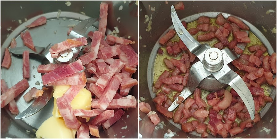 2. - Luego ponemos en una cacerola (aunque yo sigo con el robot) el bacon picado con la mantequilla y lo rehogamos a fuego medio alto, durante unos 5 o 7 minutos.