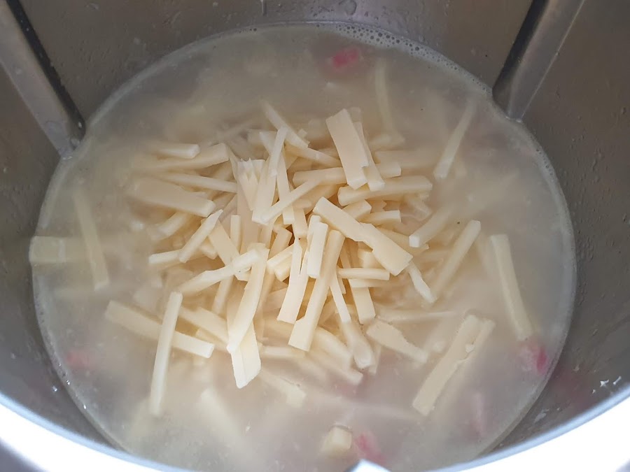 6. - Una vez pasado los 15 minutos, retiramos del fuego, le añadimos la mitad del queso que tenemos y removemos para que se reparta bien y encendemos el horno con el gratinador a tope.