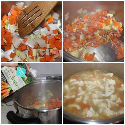 Pasado ese tiempo añadimos la coliflor en ramitos y dejamos que se cueza unos minutos mas . Debe estar al dente.