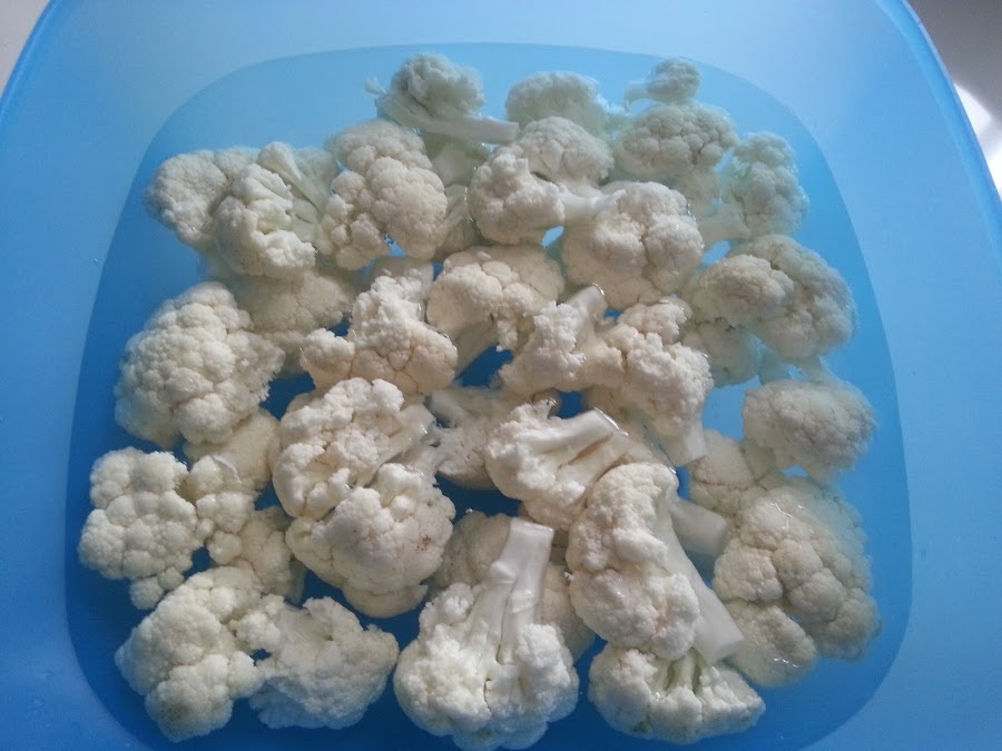 6. - Mientras vamos sacando ramilletes de la coliflor y los echamos en un cuenco con agua para enjuagarlos un poco.