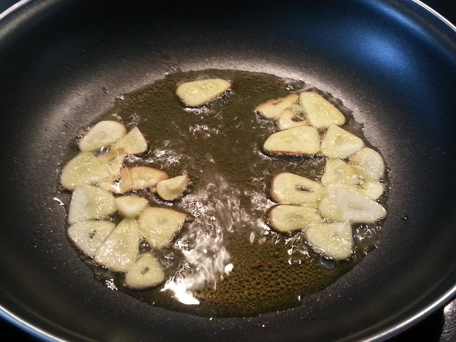 1. - En primer lugar ponemos el ajo laminado a dorar en una sartén con el aceite.