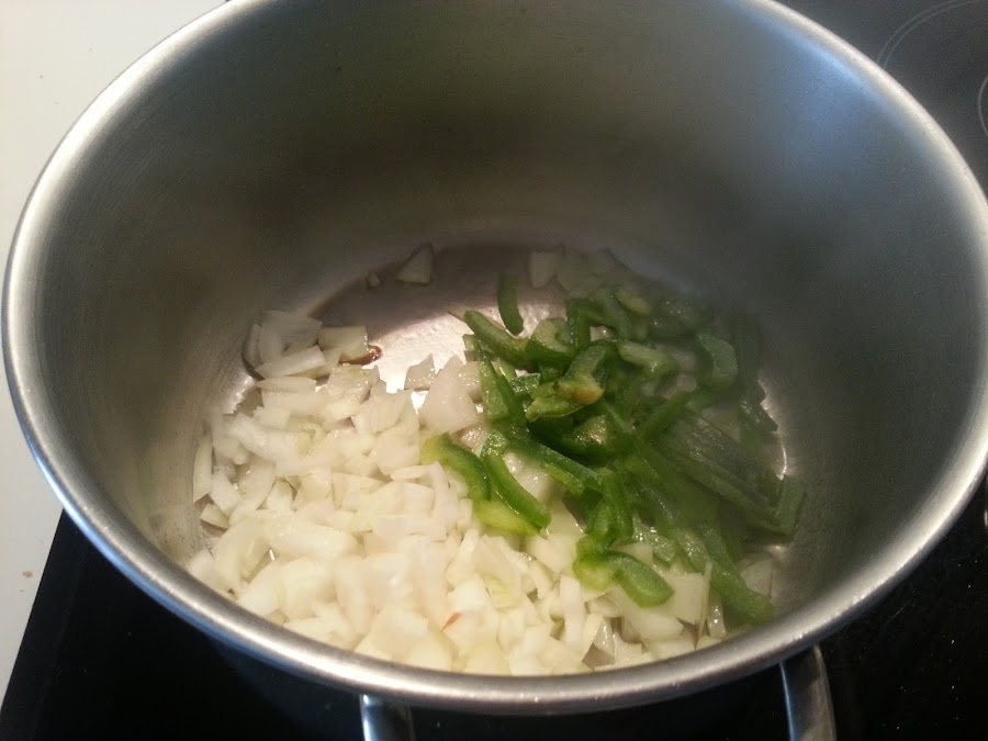 3. - Ponemos a pochar la cebolla picada con el pimiento, la sal y un poco de aceite en una cacerola honda.