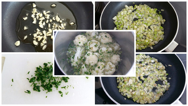 3.-Cuando veamos que el ajo y la cebolleta adquieren un ligero tono tostado, volcamos el contenido de la sartén en la olla donde está la coliflor y también el perejil picado. Si no estás a dieta, llegado este punto puedes añadir un par de puñados de fideos finos. Dejamos que se guise todo hasta que la coliflor y los fideos estén tiernos.