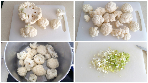 1.-Lo primero que tenemos que hacer es poner el agua en una olla al fuego. Mientras se calienta, cortamos y retiramos el tallo gordo de la coliflor con ayuda de un cuchillo y la enjuagamos bien. Separamos los cogollos de la coliflor y los ponemos en la olla con el agua caliente para que se cuezan a fuego medio.