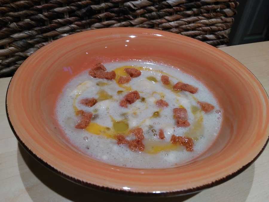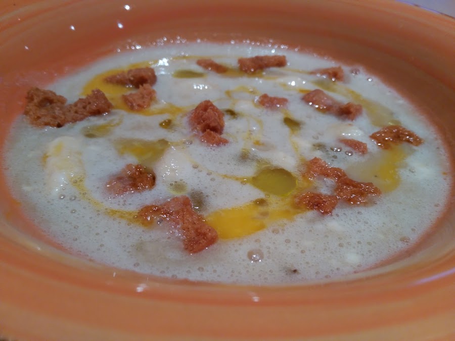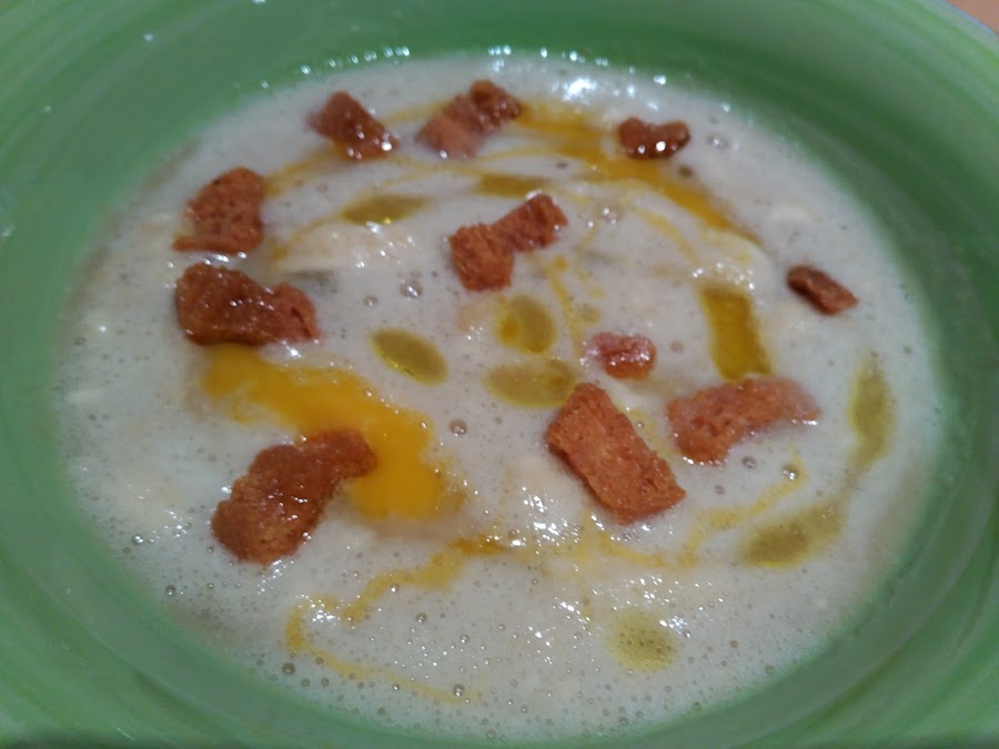 - Rectificamos el punto de sal y servimos, decorando con un hilo de aceite, de yema y unos picatostes de pan tostado.