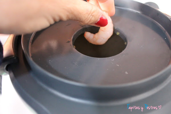 Y cuando falte un minuto echamos las gambas por el bocal y dejamos que acabe la cocción.