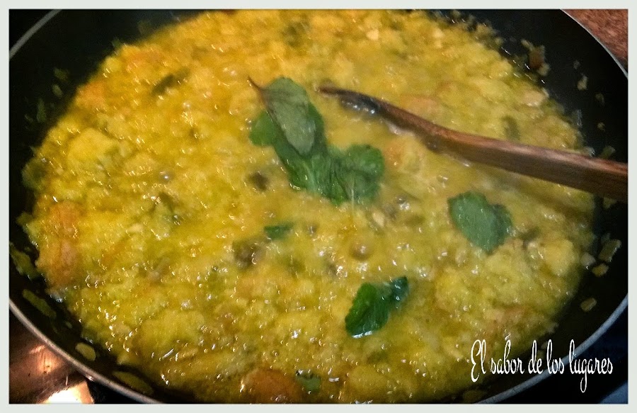 Cuece las verduras unos 7 minutos. Incorpora el pan, la hierbabuena y la pizca de colorante.