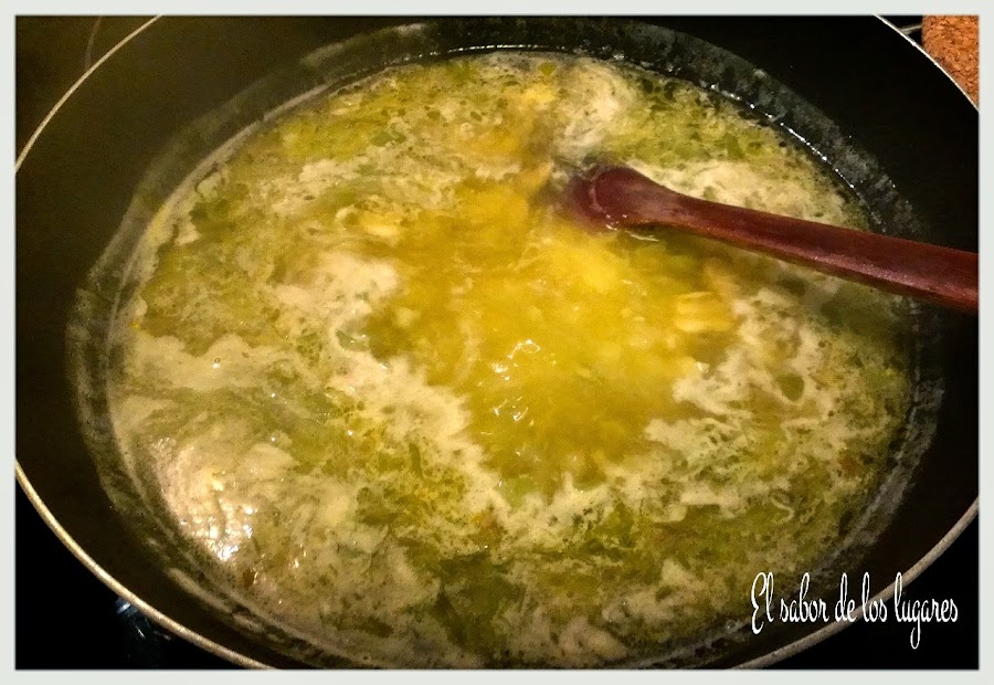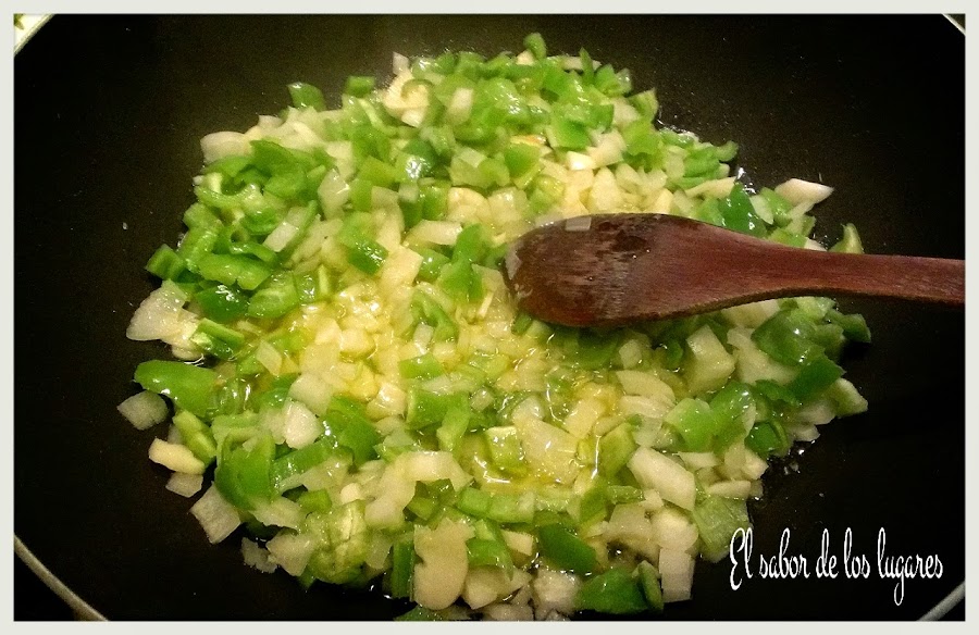 Pica finamente la cebolla, los ajos y los pimientos. Sofríe en una cazuela con 3 o 4 cucharas de aceite. Una vez que las verduras estén tiernas y antes de que se doren, añade el caldo que has reservado.