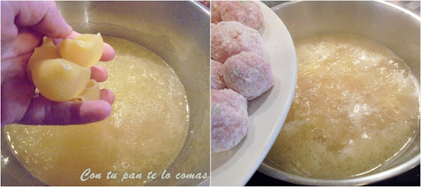 4. Una vez que tengamos el caldo de pollo ya hecho, lo colamos y lo ponemos a hervir de nuevo en otra cazuela. Añadimos los galets y los dejamos hervir diez minutos. Esta pasta tarda como mínimo unos 20 minutos en hacerse, de manera que a los diez minutos añadimos las albóndigas de una en una para que se hagan junto con la pasta. Así todo estará hecho a la vez cuando terminen de cocerse los galets.