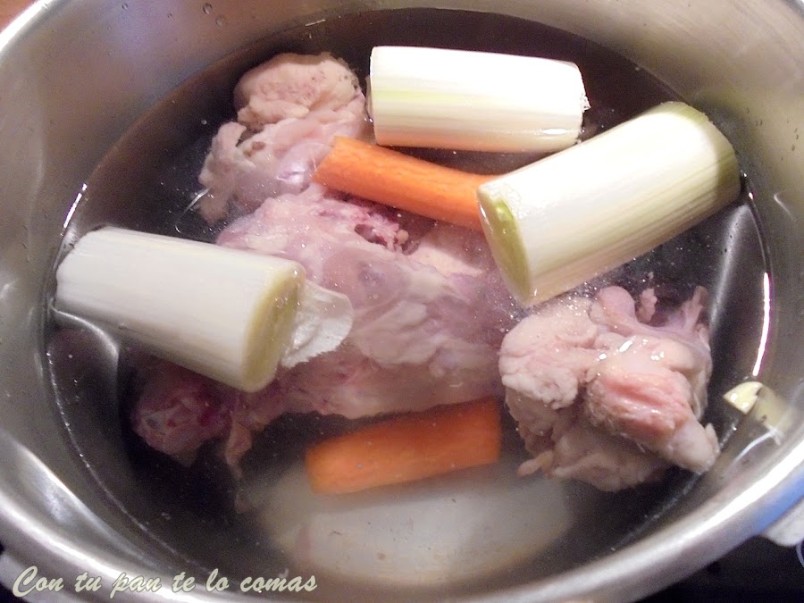 1. En primer lugar haremos el caldo de pollo con las carcasas, el puerro y las zanahorias poniendo todo en una olla con agua y sal. Si tienes olla a presión se hará en pocos minutos y en olla normal habrá que dejarlo por lo menos una hora.