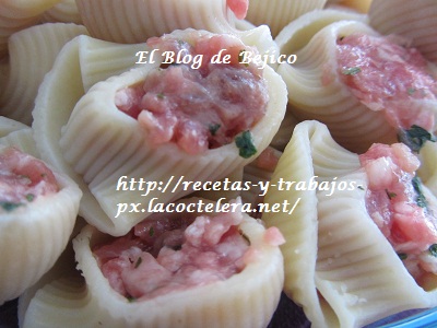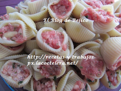 Con la farsa de carne picada rellenamos los galets, o tiburones gigantes.