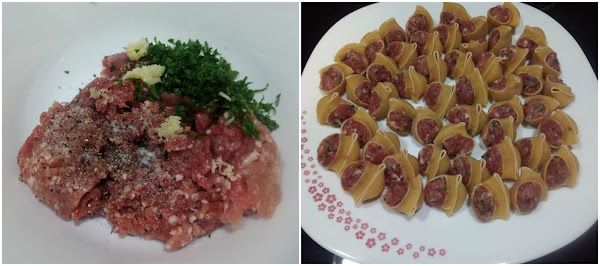 En un bol mezclamos la carne con el perejil picado muy fino, el diente de ajo rallado, una pizca de sal y pimienta al gusto.Una vez listo solo queda rellenar los galets. A mi me resultó más sencillo hacerlo con la mano pero podéis utilizar una cucharilla o una manga pastelera.