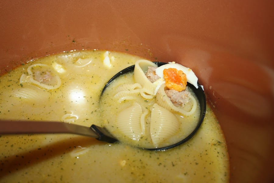 Cuando pite, despresurizamos inmediatamente, retiramos los huevos, pelamos y picamos, y los añadimos a la sopa.