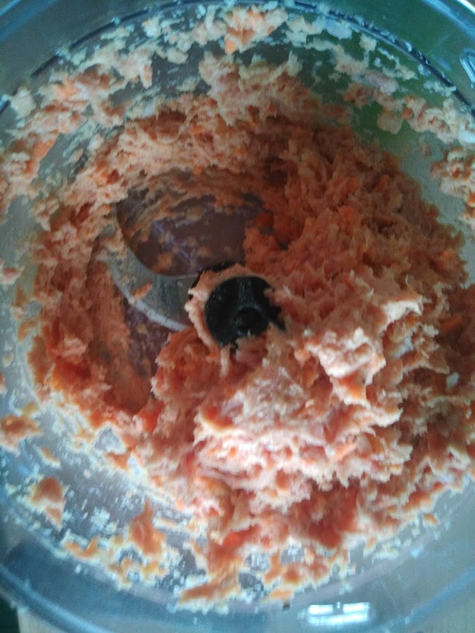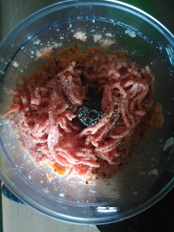 Incorporamos la carne picada salpimentada y trituramos/mezclamos con la pasta anterior.