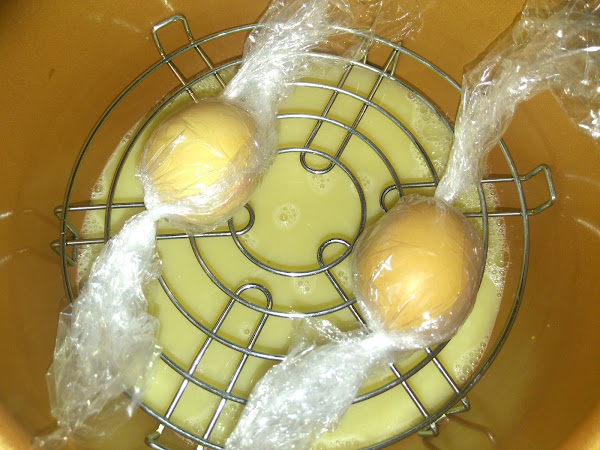 Introducimos los galets en el caldo, colocamos la rejilla y sobre ésta los huevos.