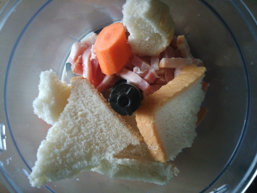 Pelamos la zanahoria y humedecemos la rebanada de pan. Lo colocamos en el accesorio picador de la batidora junto con el bacon y trituramos hasta que se forme una pasta homogenea.
