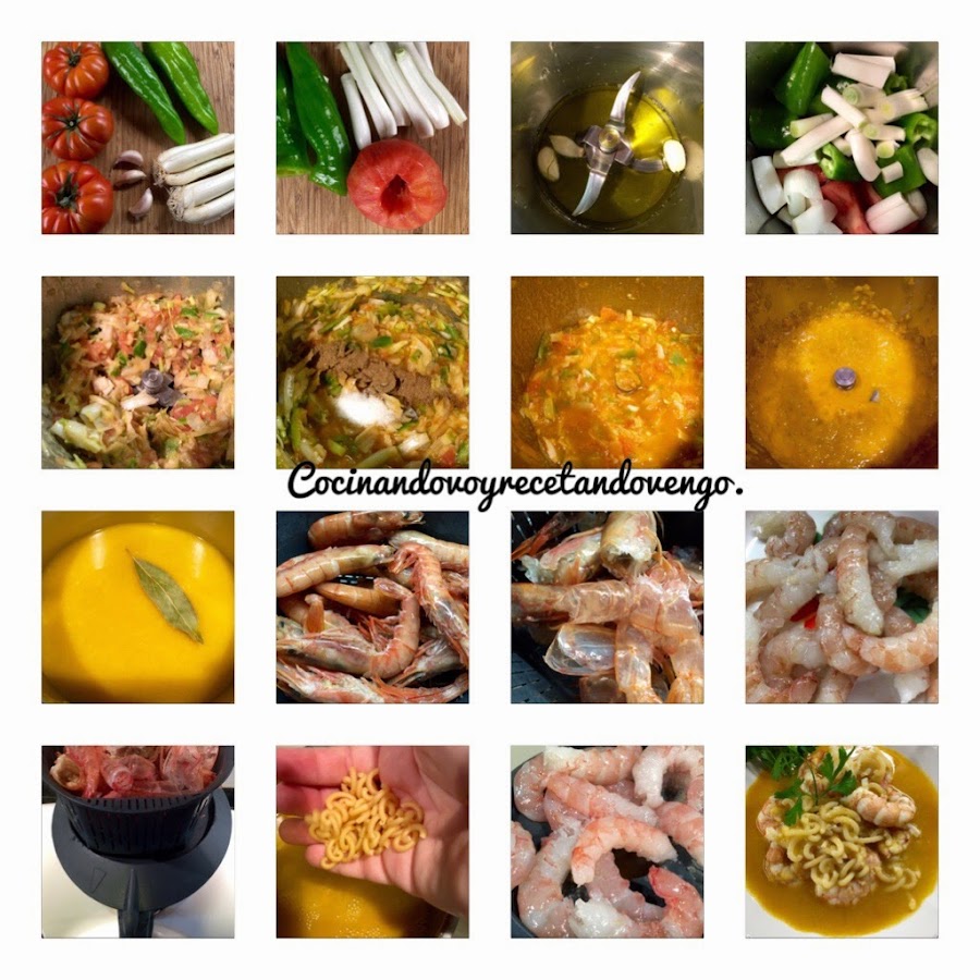 Dejamos calentar unos 10 minutos y luego añadimos los fideos del grosor deseado. Dejamos cocinar los fideos el tiempo que nos indique el fabricante en el envase y en los últimos dos minutos añadimos los cuerpos de las gambas. Dejamos reposar levemente. Y a disfrutar de esta deliciosa sopa.