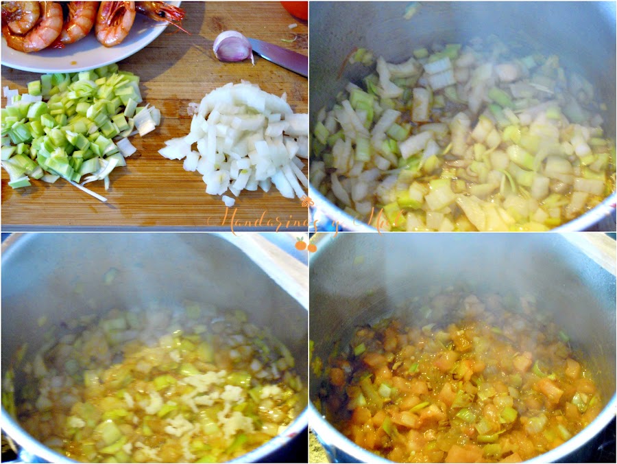 Calienta el aceite que habrá quedado en la cazuela de freír las gambas, cuando esté caliente añade la cebolla y el puerro picados.