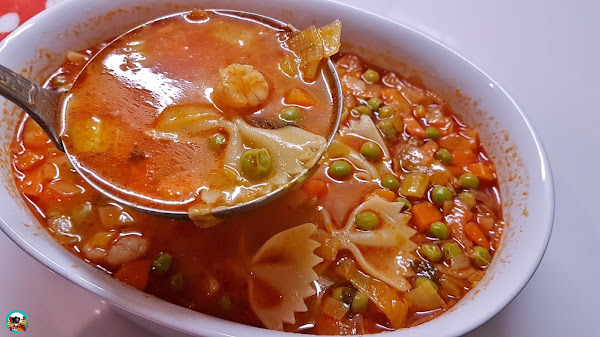 Para hoy tengo un plato de rica sopa de gambas con lazos de pasta y verduras. Un plato así siempre apetece en cualquier momento, da igual si lo degustamos de primero en una comida o para una cena como plato único en una noche fría de primavera o invierno.