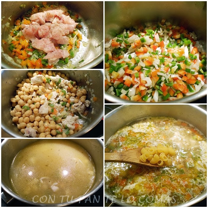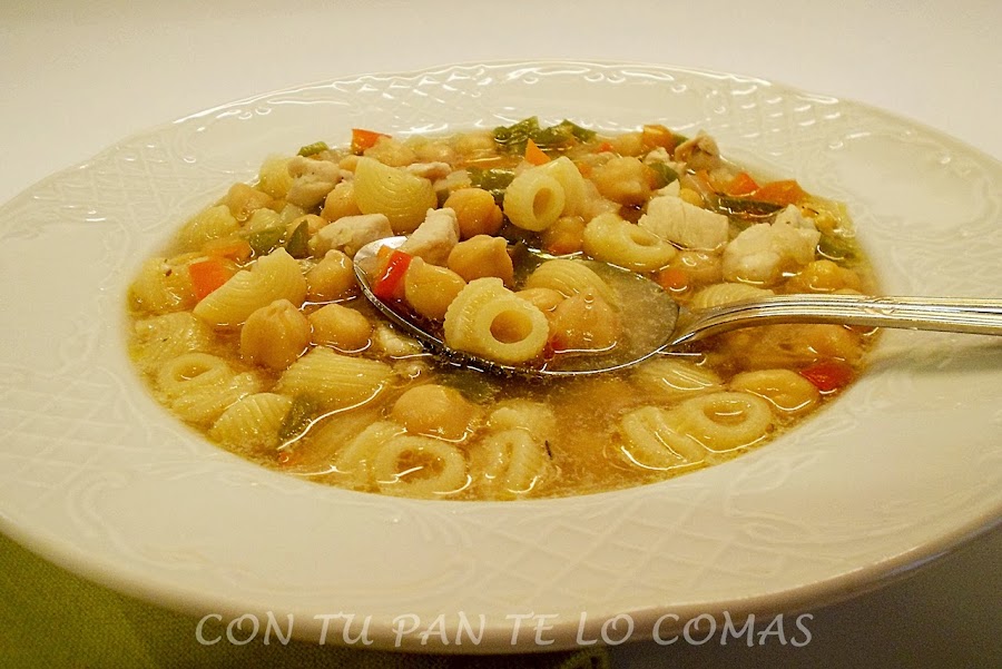 Así que como estos días hace un frío que pela, lo mejor es empezar la semana con esta sopa calentita y muy completa: legumbres, pollo, verduritas y pasta. Y un toque de tomillo que le da un sabor especial.