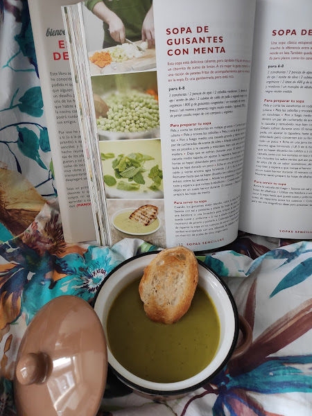 Cuando los guisantes estén blandos retiramos la sopa del fuego. Sazonamos con sal y pimienta y añadimos las hojas de menta. Utilizaremos una batidora para triturar la sopa hasta que quede suave y uniforme. Si vamos a añadir el jamón, ahora es el momento de picarlo y ponerlo. Calentamos bien de nuevo antes de repartir la sopa en los cuencos de servir. Está buenísima acompañada de una rebanada de pan tostado regado con un chorrito de aceite de oliva.