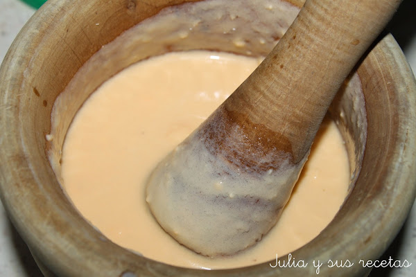 Las yemas las ponemos en un mortero y las machacamos con una o dos cucharadas de caldo.