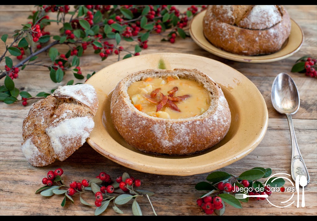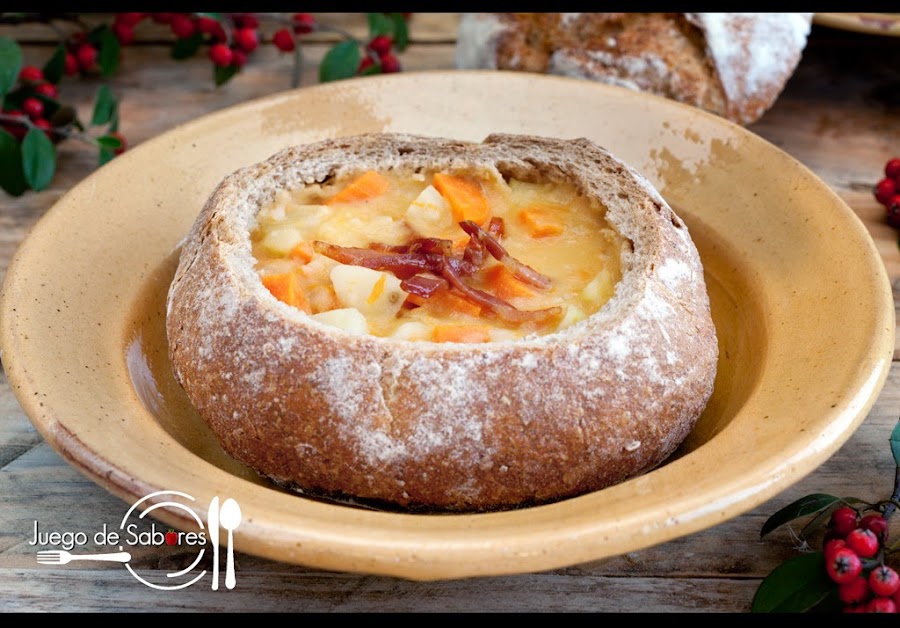 Esta sopa es ideal para servir dentro de panes o bollos a los que previamente se les ha quitado la miga y una vez vacíos se les añade la crema. Es importante que el pan tenga una costra gruesa y dura, aunque también se puede servir en tazones.