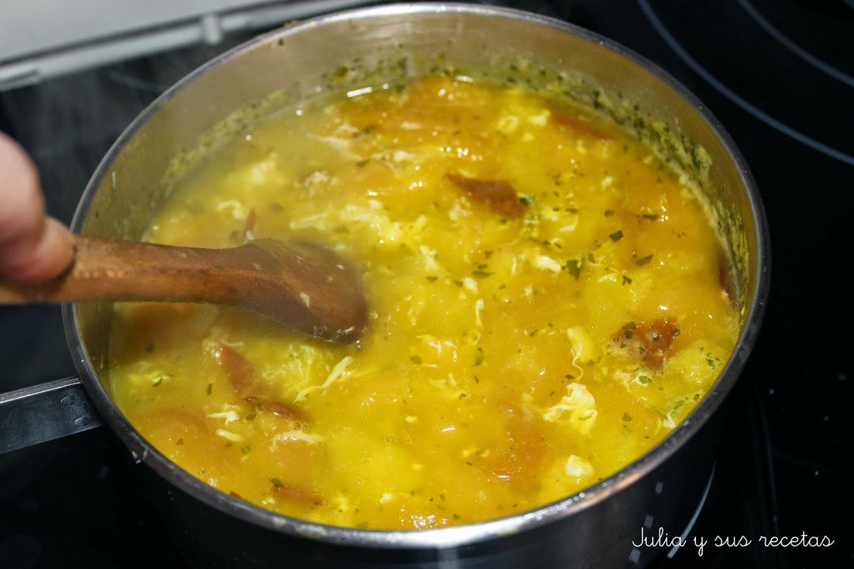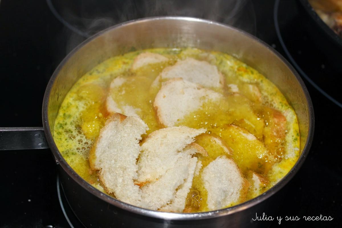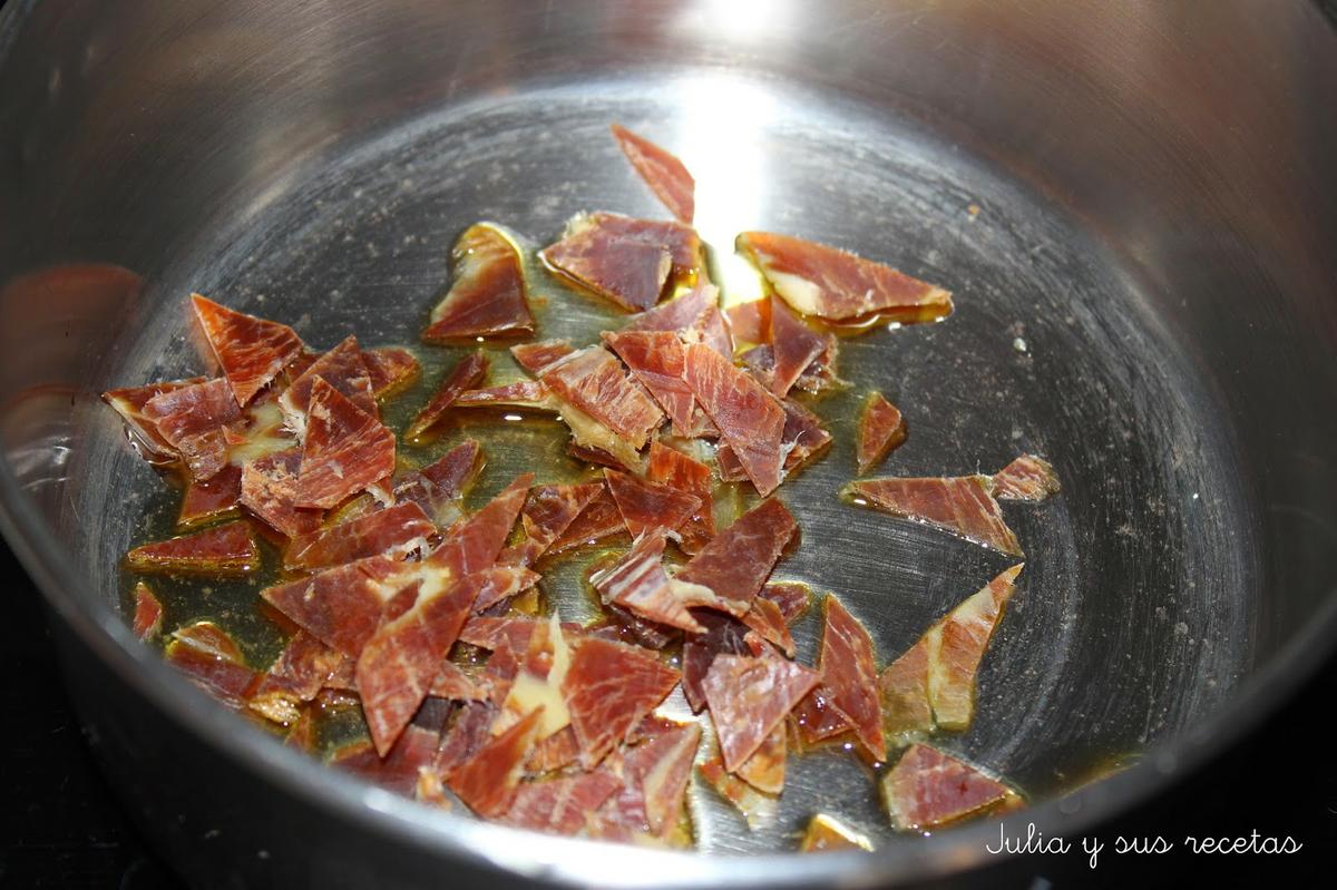 Y se le añade al jamón junto con la pastilla de caldo o caldo casero, el colorante y mas agua si hace falta. Se deja cocer unos minutos y se añade el pan picado en lonchas finitas.