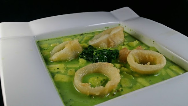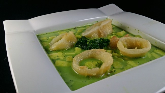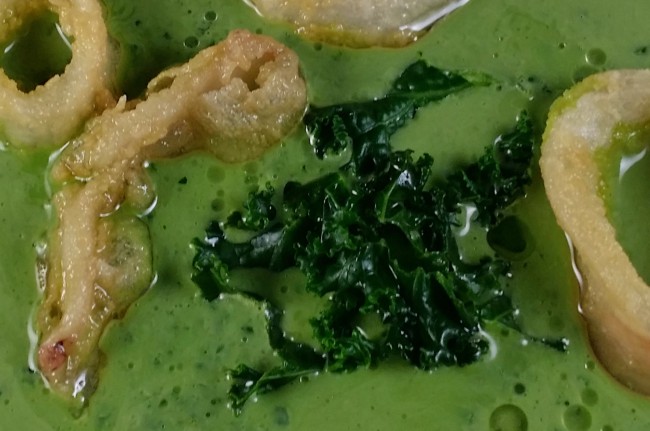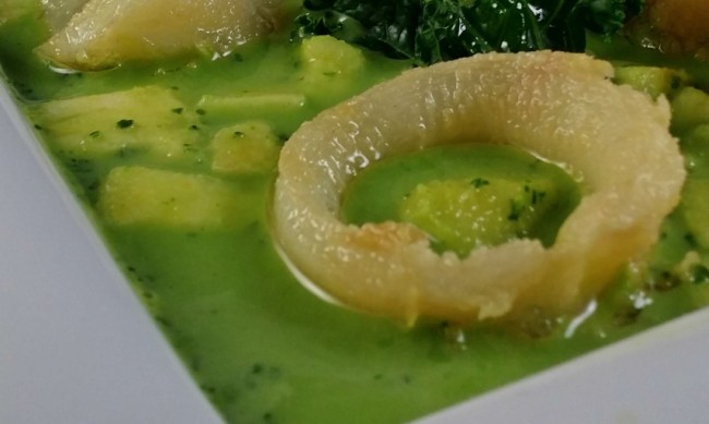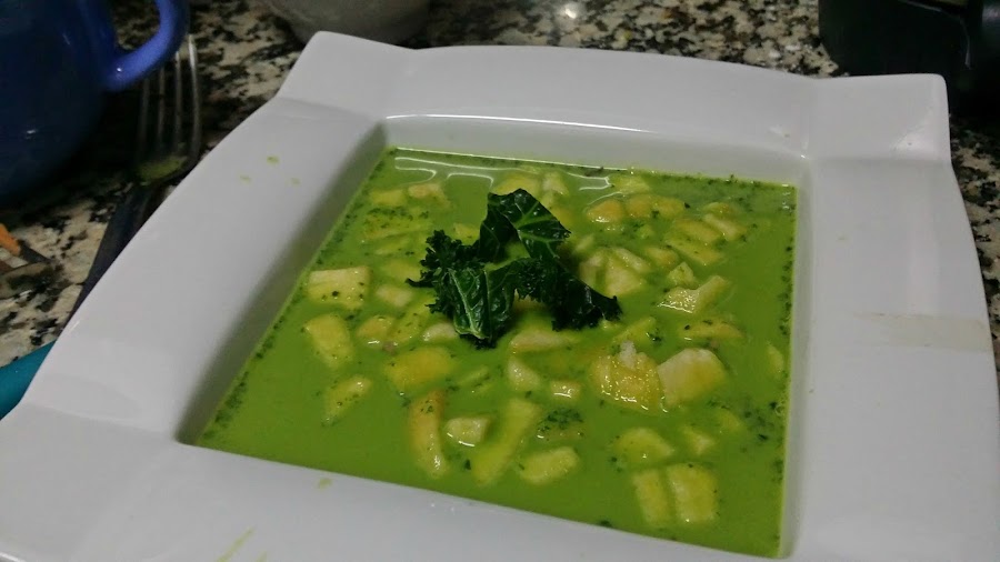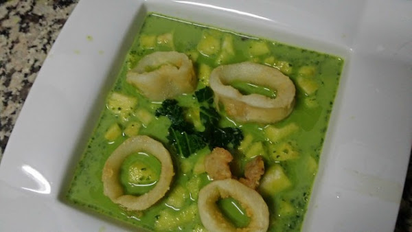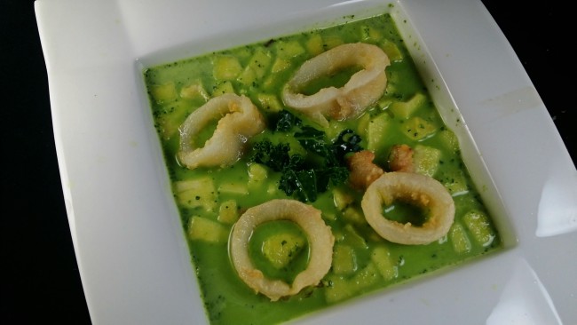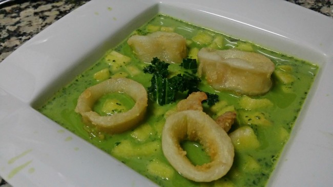 Y si contamos, además que recientemente me dejé en “pendientes” una Sopa cremosa de Kale que nos enseñó April del blog Aprils Kitch, ¡tanto mejor! No tenía muy clara la mezcla con los calamares, no sabía si iba a quedar buena pero me tiré al ruedo y aquí os traigo mi sopa de kale con calamares.
