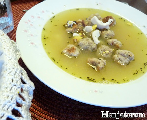 un caldo concentrado de carne con albóndigas y huevo.