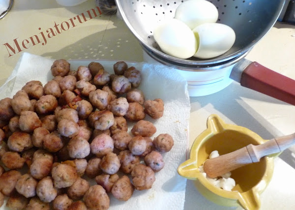 Colamos el caldo de la carne,añadimos las albóndigas y los huevos picados, ponemos a fuego medio 20 minutos, cuando empiece a hervir incorporamos la picada hecha.