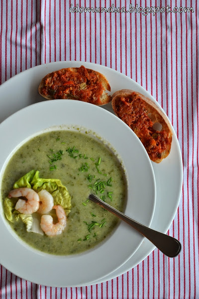 - Servimos la sopa en cada plato, ponemos un poco de cebollino picado por encima y adornamos con una hojita de lechuga de las que teníamos reservadas y 3 gambas.