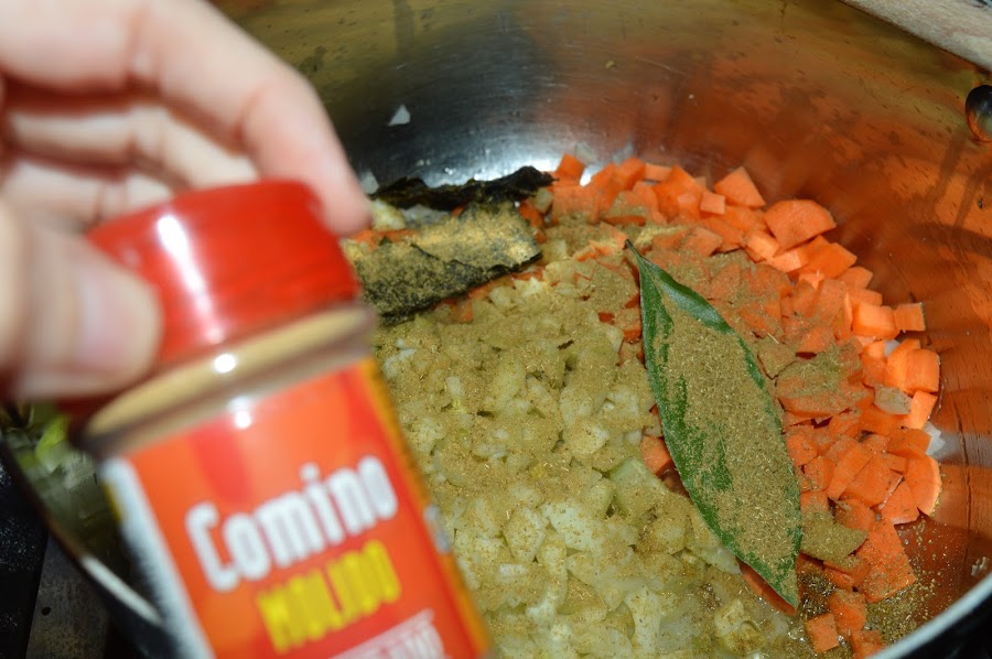 Una vez pochadas añadimos las verduras restantes (zanahorias e hinojo), removemos bien y añadimos el laurel, las lentejas y el comino en polvo y el alga kombu.