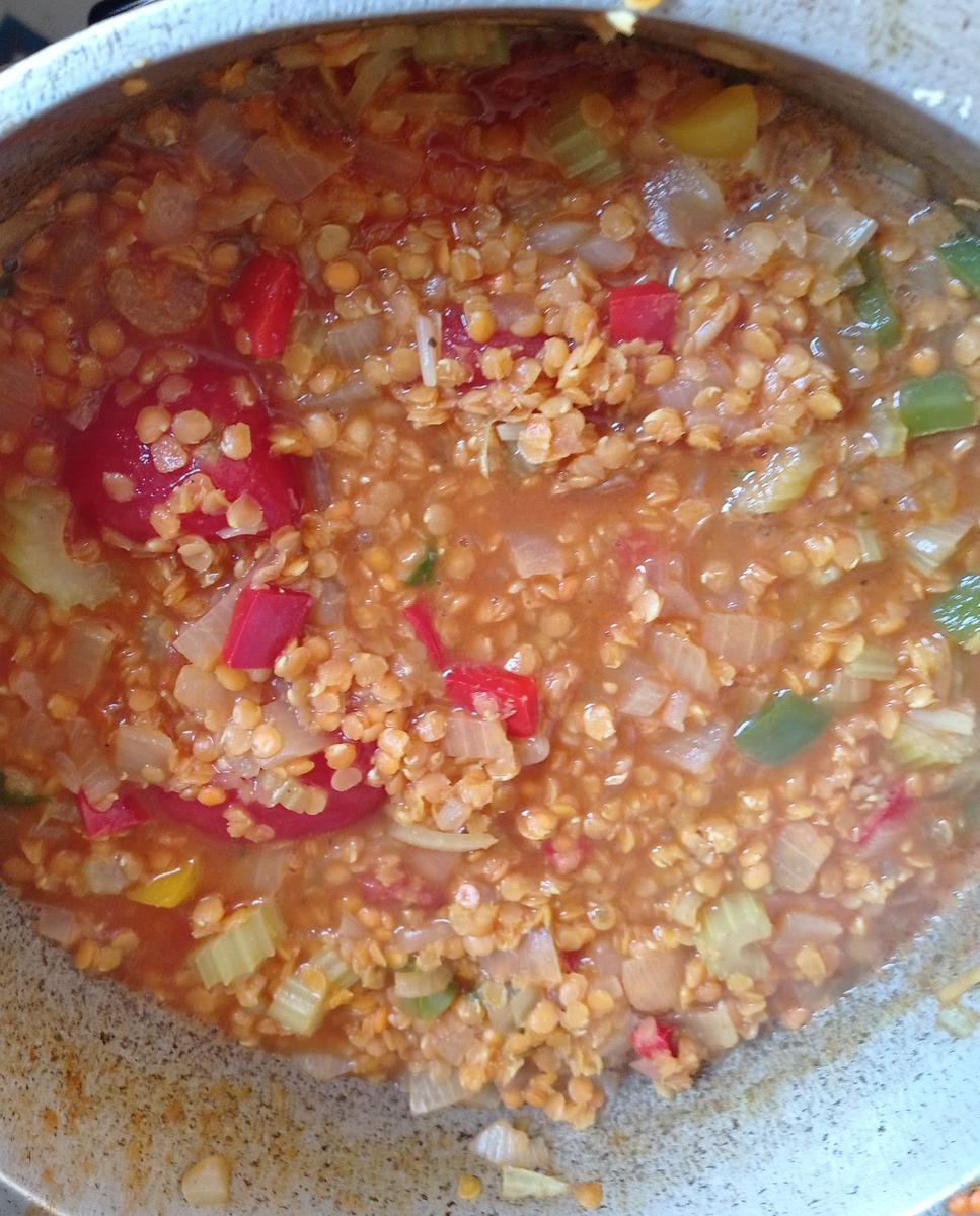 Agregar las lentejas y el caldo y cocinar 10 minutos más, luego sumar los tomates bien picados. cocinar 10 minutos más.