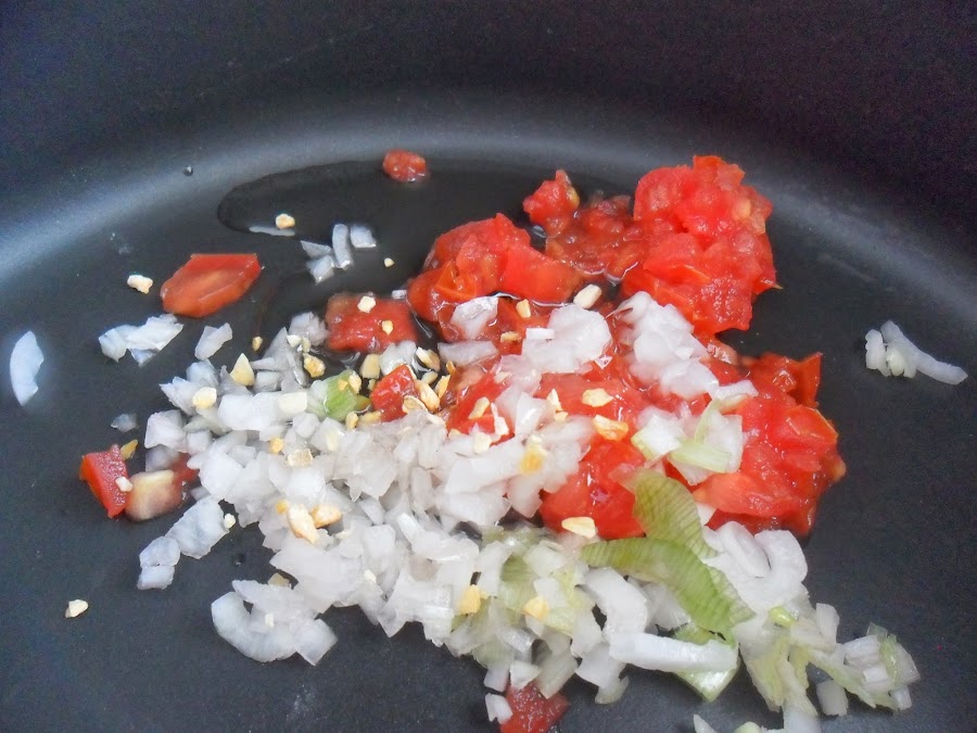 · Agregue la cebolla el ajo y el tomate.