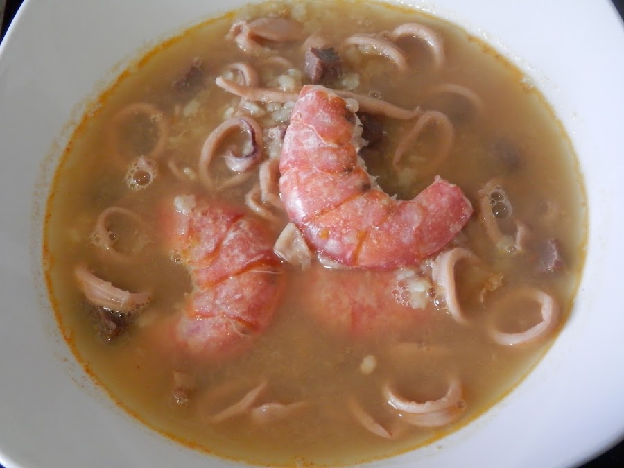 Cuando haya transcurrido la hora, añadimos los gambones y dejamos cocer durante seis minutos más.